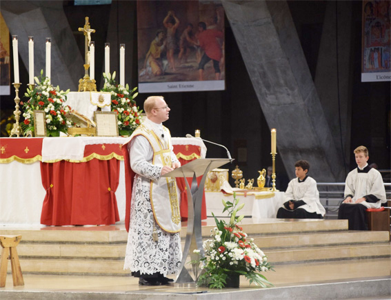 Nato l’11 settembre 1986, è stato ordinato sacerdote nel Seminario San Pio X a Ecône il 29 giugno 2015. E’ stato nominato collaboratore alla Scuola Saint-Michel Garicoïtz, e direttore dopo due anni. Ha assunto la direzione della Scuola Saint-Joseph-des-Carmes nel 2018. Il 15 agosto del 2024 è stato nominato Superiore del Distretto di Francia da Don Davide Pagliarani, Superiore Generale della Fraternità Sacerdotale San Pio X ![]() Don Gonzague Peignot pronuncia il sermone Cari fedeli, Oggi, sono cinquant’anni che il nostro Distretto ha aperto il nostro primo Priorato. Cinquant’anni da quando abbiamo intrapreso la riconquista del nostro paese. I frutti di questa lotta sono magnifici; il Buon Dio ha benedetto questa bella opera della Fraternità San Pio X, ed è certo che la figlia primogenita della Chiesa conserva un posto privilegiato nel Cuore di Nostro Signore, in quello della Madonna. Lo vediamo facilmente nello sviluppo senza pari del Distretto di Francia. Bisogna esserne fieri. Malgrado questo bellissimo sviluppo, la vittoria definitiva, vittoria assicurata perché ci è stata promessa dal Cuore Immacolato di Maria, questa vittoria sembra ancora lontana. E questo non per mancanza di generosità, per mancanza di opere, per mancanza di apostolato. Ma è perché permangono alcuni ostacoli; come per gli Apostoli inviati da Nostro Signore Gesù Cristo per guarire i malati e istruire il popolo, vi sono alcuni demoni che resistono, che impediscono il pieno sviluppo. Di fronte all’impotenza confessata dagli Apostoli, Nostro Signore Gesù Cristo ha dato il rimedio: «Vi sono dei demoni che possono essere scacciati solo con la preghiera e il digiuno». I demoni che incatenano il nostro mondo, il nostro paese, sono di questo tipo. Se noi vogliamo trionfare dobbiamo prendere questi demoni per le corna e malmenarli, aggredirli, schiacciarli come fa la Madonna! E’ per questo che veniamo in pellegrinaggio a Lourdes, per attingere dal Cuore della Madonna la forza per scacciare questi demoni dal nostro paese, dalle nostre famiglie, dai nostri cuori. Ora, in che modo Satana impone oggi il suo regno, la sua legge? In che modo siamo portati a subire l’atmosfera che Satana ispira nel mondo? Certo, vi sono aspetti diversi, ma oggi vi è una evidenza che appare chiaramente: noi siamo portati ad essere dipendenti e talvolta anche un po’ schiavi dei nostri schermi, delle nostre reti sociali, del consumo dei film e delle serie o dei brevi video; così siamo un po’ schiavi e questo impedisce il pieno sviluppo della nostra vita cristiana, noi siamo schiavi dello sguardo degli altri, di ciò che pensano di noi quelli che ci circondano. Ecco, è su questo che deve rivolgersi il nostro digiuno. L’avete quindi capito, e la Madonna nella sua materna delicatezza ce lo ha insegnato: non si tratta di fare un digiuno «alimentare», ma si tratta di fare un digiuno di ciò contamina il nostro cuore. «Non è ciò che entra nella bocca che contamina l’uomo, ma ciò che esce dal suo cuore» ci dice Nostro Signore Gesù Cristo. E questo digiuno ha una doppia importanza: non solo di tratta di scacciare questi demoni e la distruzione di questo ostacolo che essi costituiscono assicurerà una abbondanza delle grazie necessarie per la vittoria, ma bisogna non più pensare che siamo invulnerabili e allora questo ci permetterà di non affondare. In effetti, è facile constatare, come mai prima, che i cuori si sporcano perché noi guardiamo ciò che non dovremmo guardare, perché noi andiamo a conoscere ciò che non dovremmo conoscere – basta citare gli scandali che oggi la stampa pubblica spudoratamente – perché cerchiamo di essere guardati ben oltre l’intimità familiare – è l’esposizione talvolta immodesta della nostra vita sulle reti sociali -, perché noi condividiamo ovunque ciò che dovrebbe rimanere segreto, senza mai pensare che forse diffamiamo il nostro prossimo. In definitiva, questo eccesso di scambi, di condivisioni, di comunicazioni, di visioni, sporca le anime, fa perdere l’innocenza, distrugge le reputazioni, sviluppa il narcisismo, indebolisce la famiglia, la impregna dello spirito del mondo; in poche parole, questi eccessi ci riducono in schiavitù. Non possiamo fare orecchie da mercante, non possiamo non reagire, non possiamo non proteggerci, non possiamo non proteggere i nostri figli. Che fare? Non lasciamo che i nostri figli vadano liberamente su internet, non lasciamo che guardino dei film senza vigilanza e installiamo gli strumenti necessari, i filtri, per bloccare le infamità. Smettiamo anche di alimentare queste cosiddette reti sociali, che non fanno altro che alimentare l’individualismo e dunque distruggere lo spirito di famiglia e uccidono la generosità così necessaria per formare dei buoni genitori per il domani, dei buoni sacerdoti, religiosi o religiose. Bisogna riconoscere che in questo ambito sono stati fatti molti progressi. Molti vi prestano sempre più attenzione e noi abbiamo potuto constatare che le misure adottate due anni fa per chiedere alle famiglie che iscrivevano i figli nelle nostre scuole di non permettere ai loro figli di avere gli smartphone, hanno ampiamente purificato le anime degli adolescenti. Che bell’incoraggiamento! Ma è necessario perseverare, andare anche oltre. Quanto a noi, non dobbiamo avere timore di prendere grandi decisioni, di ridurre l’uso degli schermi allo stretto necessario, cioè a quanto necessario per la nostra professione, per il nostro dovere di stato, per delle relazioni familiari oneste e limitate alla sfera familiare, e non per distrarci, per rilassarci, per divertirci o, e questo sarebbe ancora più nocivo, per condividere con tutti quello che dovrebbe rimanere riservato agli intimi, per metterci in mostra, per esprimere il minimo malcontento o diffondere le nostre critiche e lasciare che si diffondano e si amplifichino fino a diventare diffamazioni talvolta gravi. Che lo smartphone non sia il prolungament