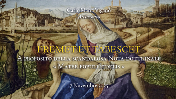 Non è dunque solo a Tucho Fernández che si deve rimproverare questa abominevole Nota, ma all’intero establishment vaticano e ai suoi vertici. Un establishment che, mentre esalta “la infinita dignità dell’uomo” ribelle a Dio, non esita ad umiliare la dignità della Donna avvolta di Luce. E questo non da oggi né da ieri, ma da sessant’anni, ossia da quando la conventicola che era appena riuscita a respingere gli schemi preparatori del Concilio aveva fatto in modo che venisse cassata anche la proclamazione del dogma della Corredenzione di Maria Santissima, auspicata da larga parte dell’Episcopato mondiale, giudicata “poco ecumenica” nei riguardi dei dissidenti protestanti. E se Tucho Fernández è giunto ad impugnare un termine teologico che trova innumerevoli menzioni nei documenti papali di Pio IX, Leone XIII, San Pio X, Benedetto XV, Pio XI e Pio XII, non è per sollecitudine verso i fedeli o per evitare formulazioni equivoche della dottrina, ma per vero e proprio odio nei confronti della Madre di Dio. È la mano di Satana che ha vergato quelle parole odiose; è il soffio gelido della dannazione eterna che le ha ispirate. Non vi è nulla di buono: nemmeno l’intenzione, che è pretestuosa e serve ad altro, anzitutto ad abituarci all’idea che ogni dottrina cattolica possa essere soggetta a mutamenti, che quello che ieri era vero oggi non lo sia più, che la Fede che ha portato in Cielo le anime fino a Pio XII possa essere diventata motivo di confusione o addirittura di eresia. Così, mentre Prevost e Tucho Fernández fingono di voler dissipare gli equivoci di una dottrina confermata invece dalla Fede semplice del popolo, si apprestano a dare consistenza teologica alla sodomia, al diaconato femminile e alla sovversione del Papato in chiave sinodale. Tout va très bien, Madame la Marquise: basta non denunciare le loro imposture e riconoscere la loro autorità. Non dobbiamo analizzare questo documento per coglierne l’indole perversa: basta guardare negli occhi coloro che ce lo propongono. Lo sguardo vuoto, sordo, tetro e privo di Carità delle anime perdute. Lo sguardo di chi, dinanzi alla Vergine Madre di Dio, invece di inchinarsi riverente, non ha altro da fare che sfruttarla per la propaganda immigrazionista – invocandoLa come Solacium migrantium – e strapparLe i titoli che la Santa Chiesa Cattolica le riconosce e con i quali il popolo fedele La venera e ottiene le Grazie di cui Ella è munifica dispensatrice. Tra queste Grazie, non mancherà di essere esaudita quella che invochiamo ardentemente: che cioè Colei che da sola sbaraglia tutte le eresie e calpesta il capo orgoglioso del Dragone infernale, affretti il trionfo del Suo Cuore Immacolato. + Carlo Maria Viganò, Arcivescovo 7 Novembre 2025